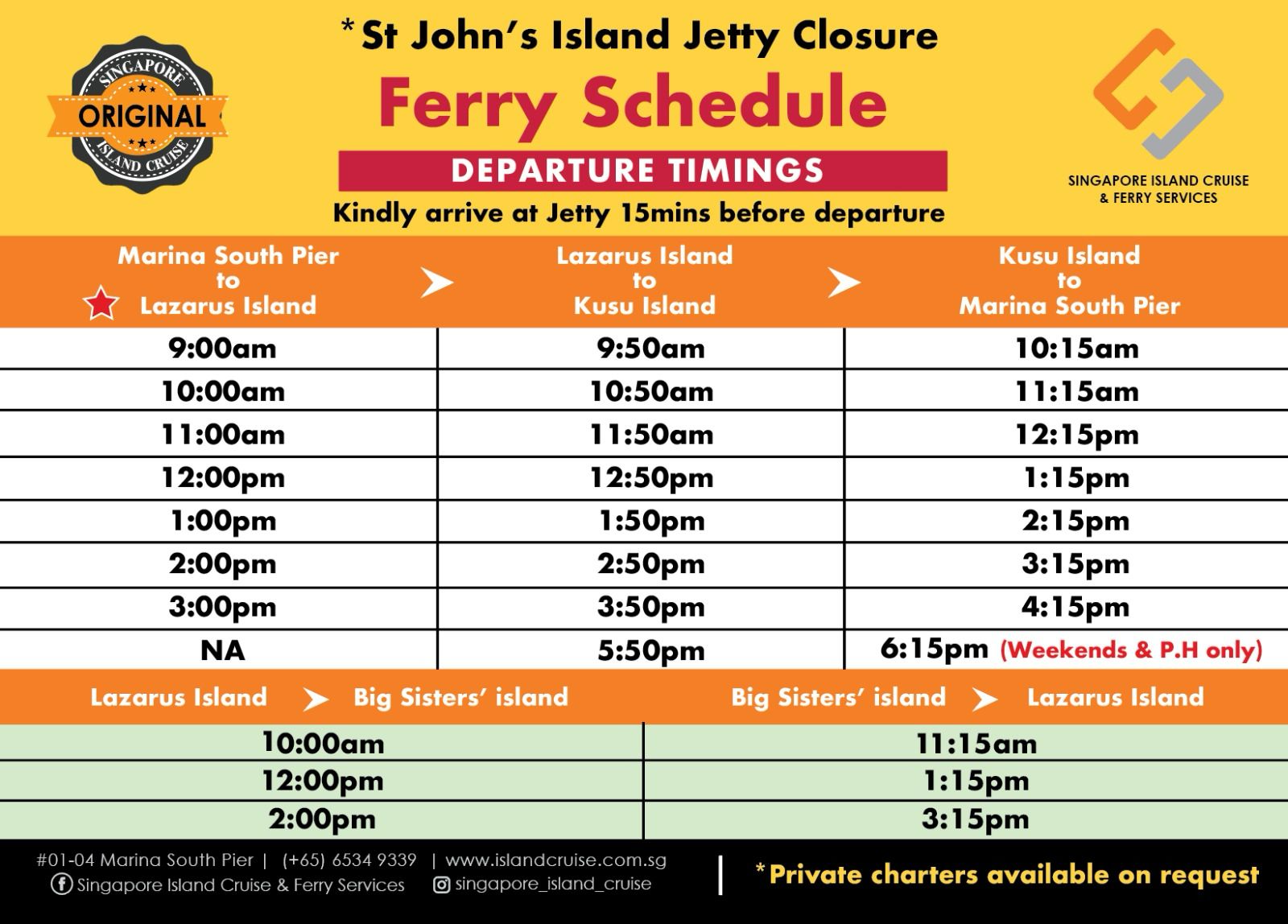 - The ferry will go from Marina South Pier to Lazarus Island, then to Kusu Island, before returning to Marina South Pier. There is no ferry service from Kusu Island to St. John’s Island.